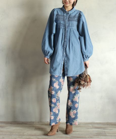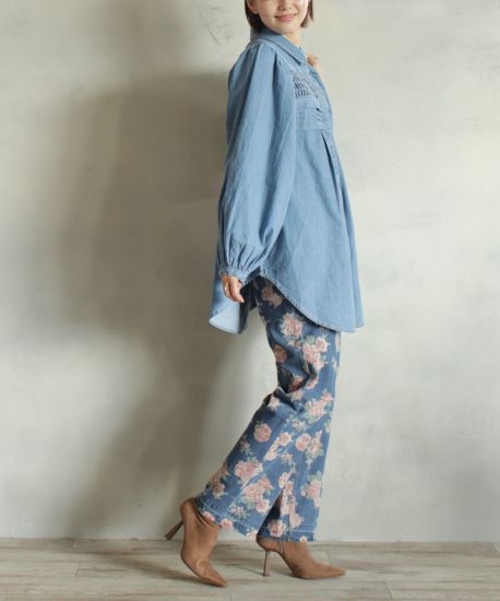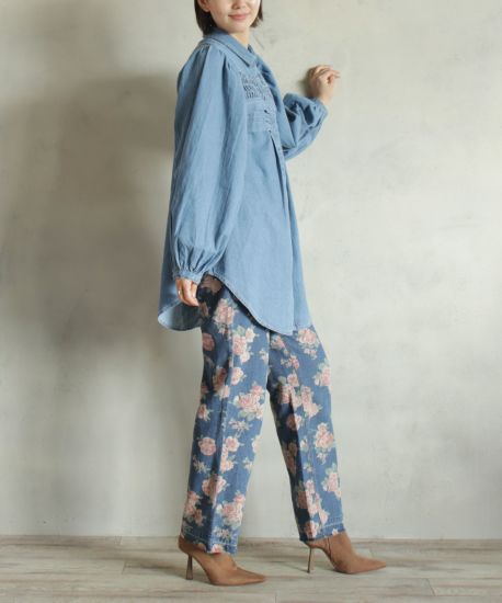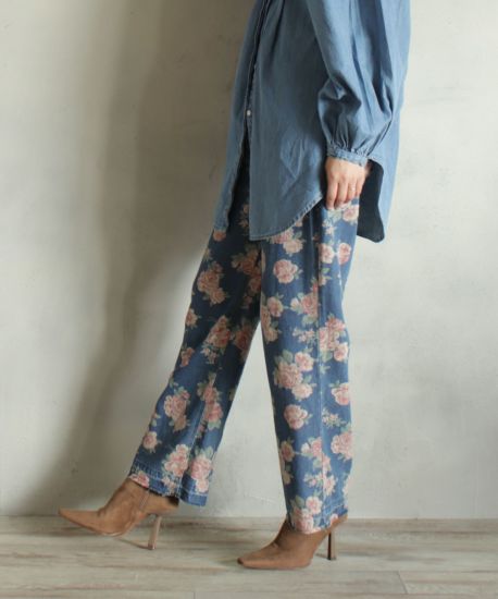 散りばめられたヴィンテージ感のある花柄がこなれ感を演出してくれるデニムパンツ。 はくだけでコーデが華やぐ主役級のアイテムです。