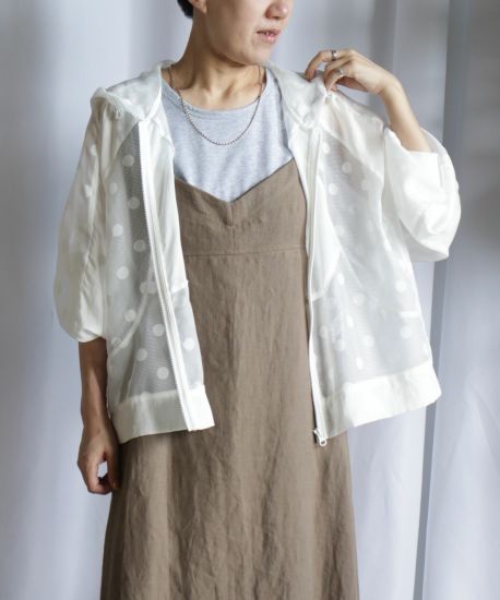 ドット柄でもモノトーンで甘くなりすぎず、シンプルに着回ししやすいライトブルゾンです