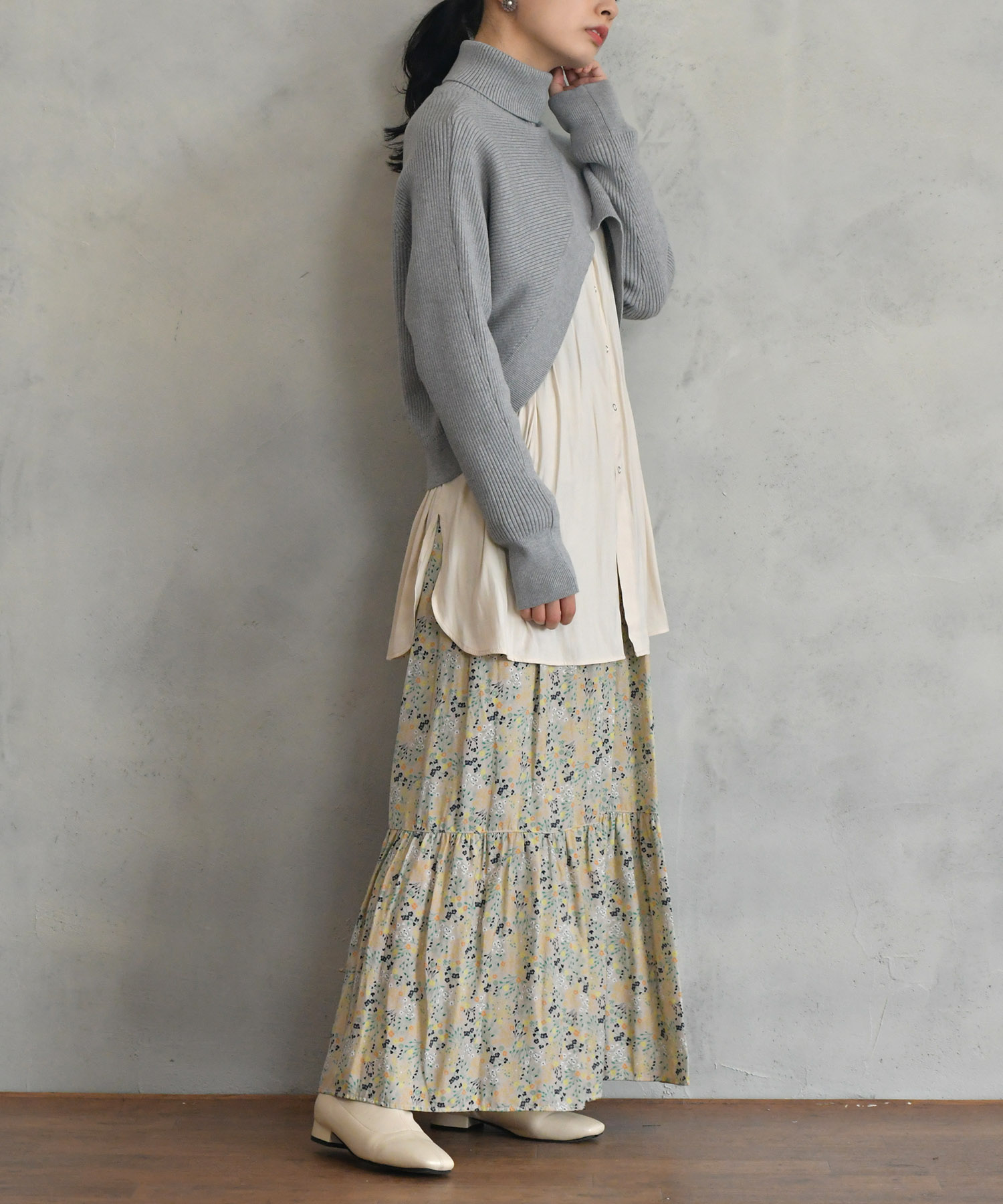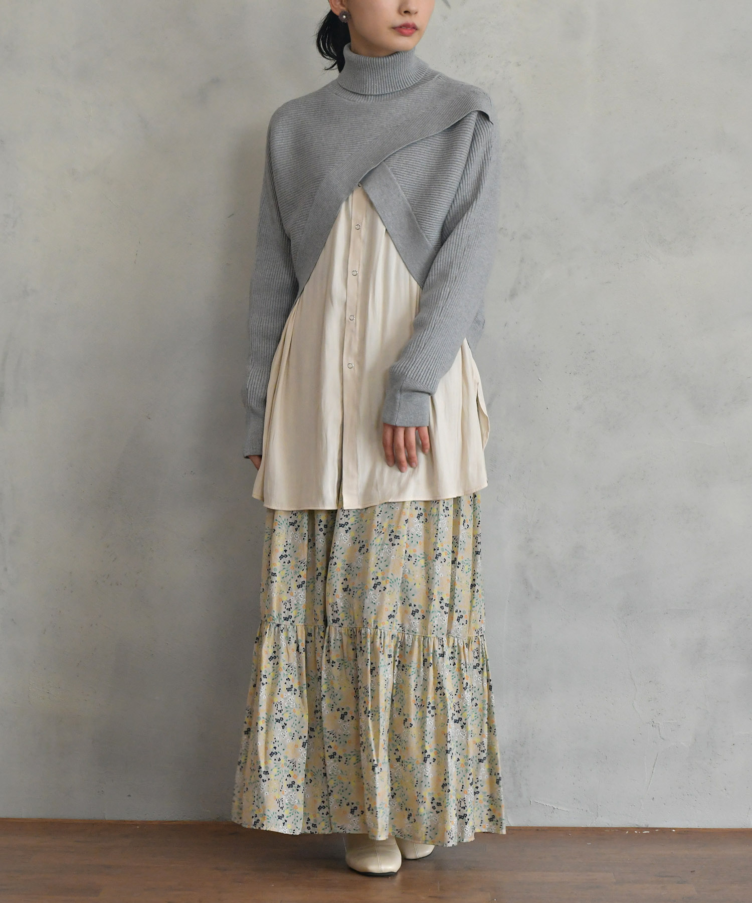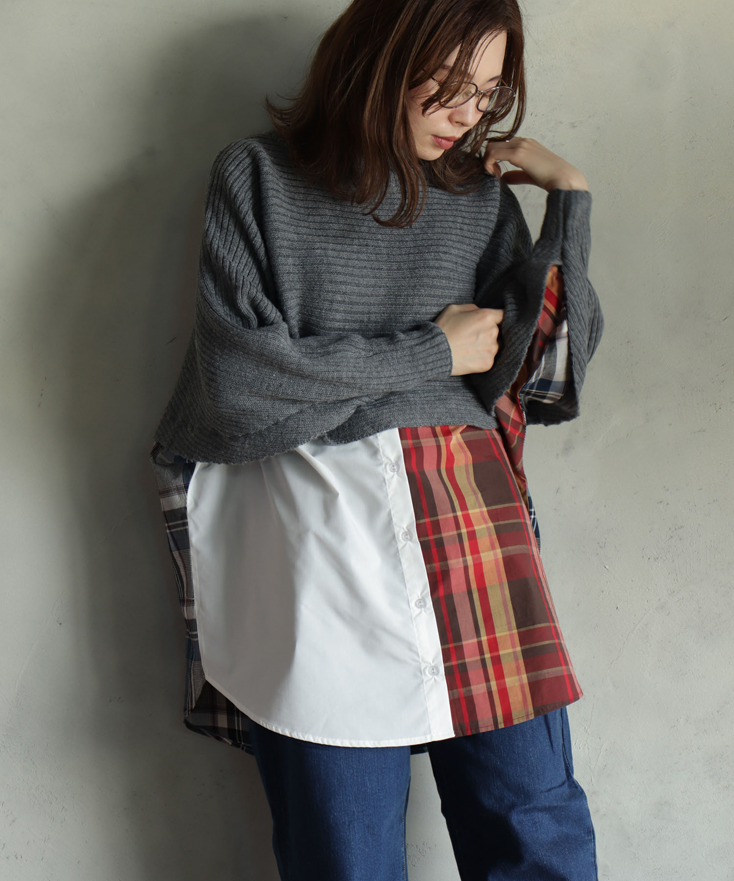 ブラウスにシャツをレイヤードしたような雰囲気のドッキングニットです。