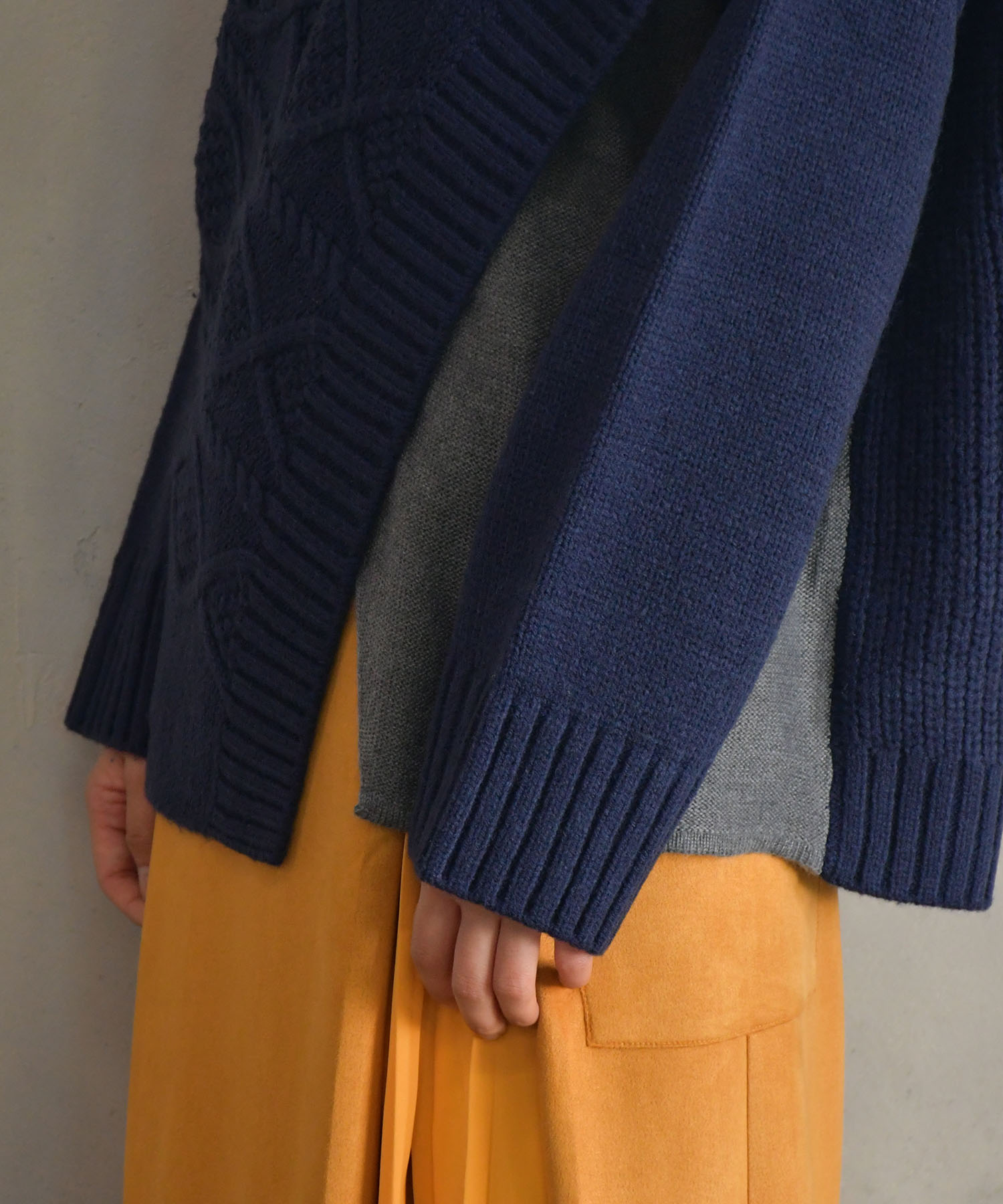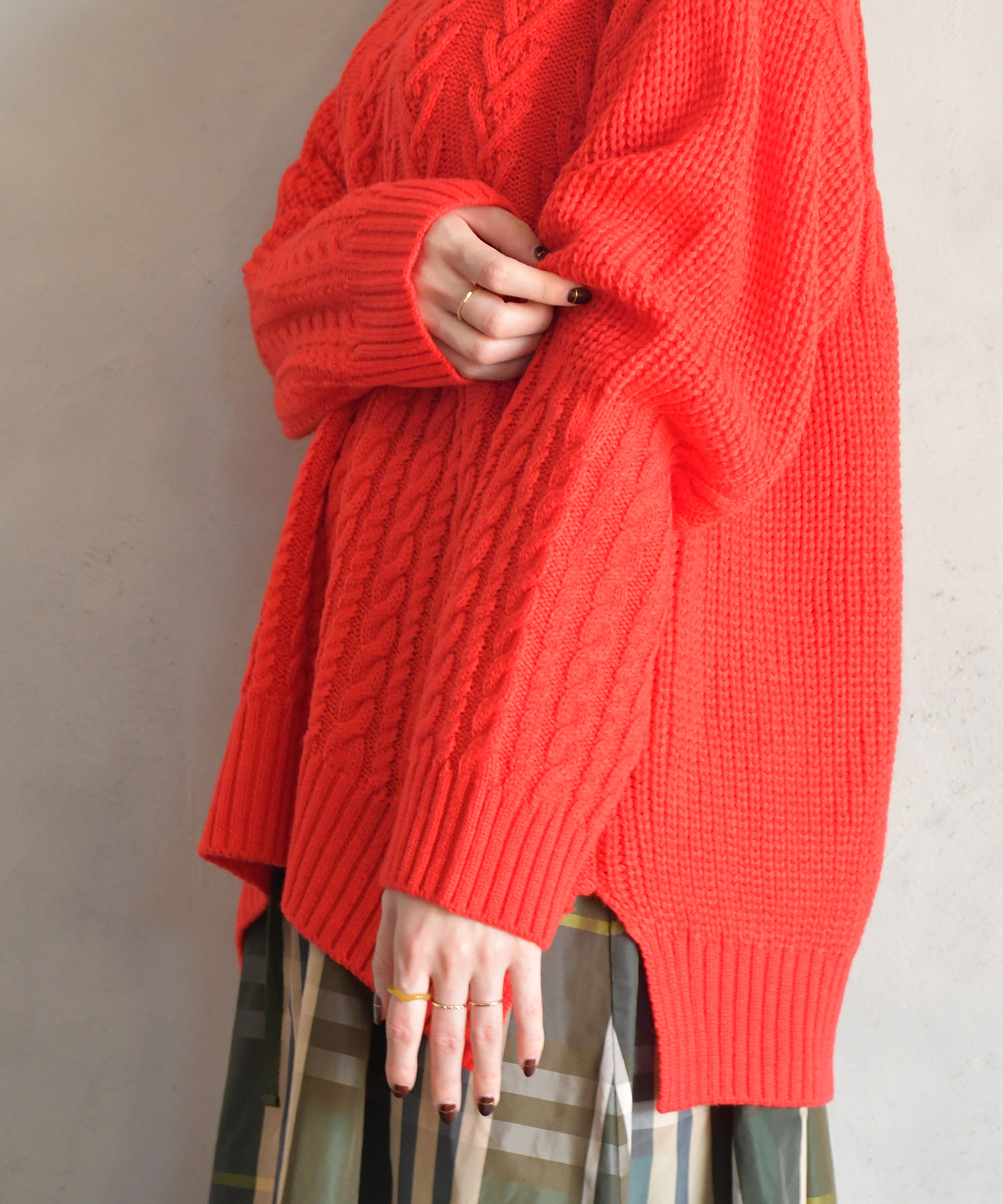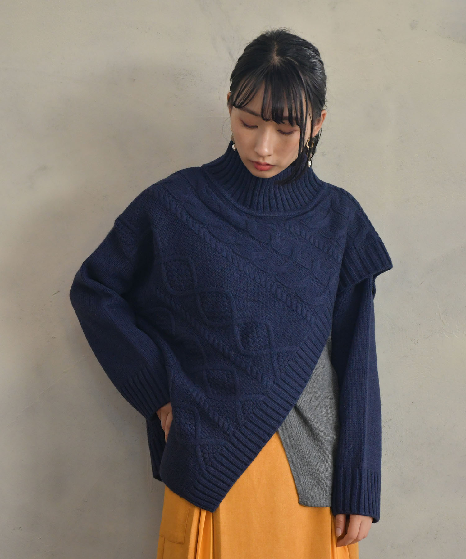 ケーブル編みのデザインがシーズンムードを高めてくれる、今年注目のケープ風ニット。アシンメトリーなシルエットに仕上げ、こなれた印象の一着に。