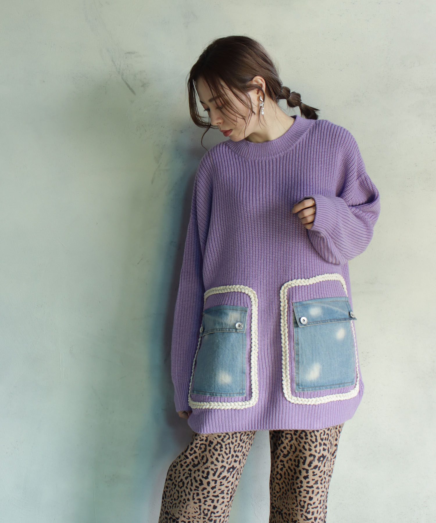 シンプルなざっくりニットに印象的なデニムのポケットをあしらった可愛らしいプルオーバー。トレンド感たっぷりのボリュームのあるシルエットで、ラフにも着こなしやすく、デイリーにも使いやすい一枚です。