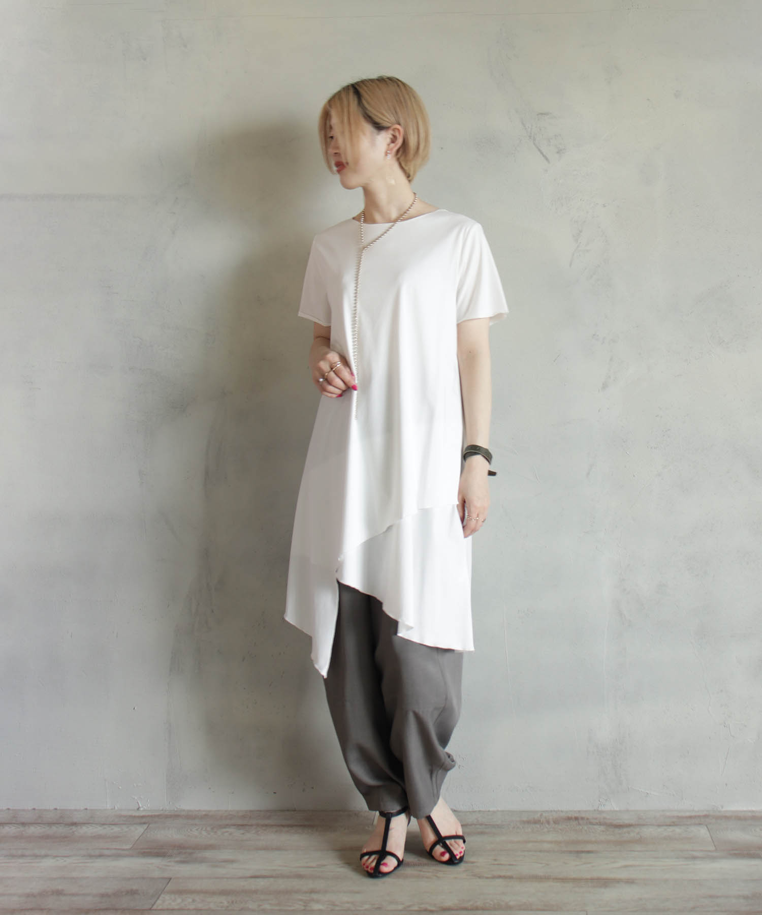 上半身はコンパクトに、胸下付近から腰回りにかけてはゆったりとしたデザインに仕上げ、細見えシルエットに見えるよう計算したアイテムです。