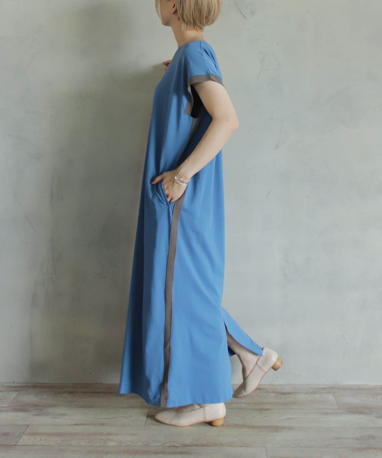 サイドに配したラインテープでスッキリ見えが叶うワンピース。体のラインを拾わないシルエット、さらに透け感もなく1枚でご着用いただけるので、蒸し暑い今時期にもおすすめなワンピースです。