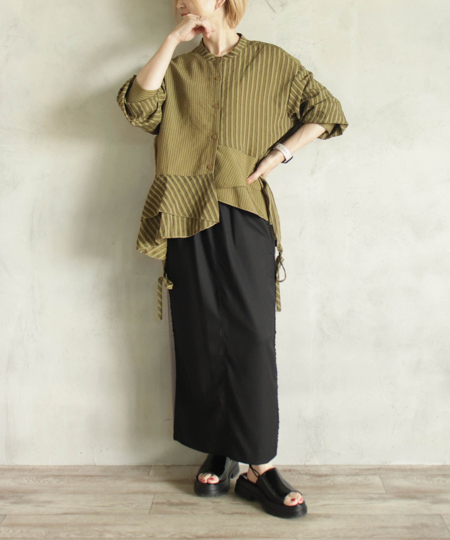 フリル部分をアシメントリーにすることでウエスト部分がスッキリ見えるように仕上げました。