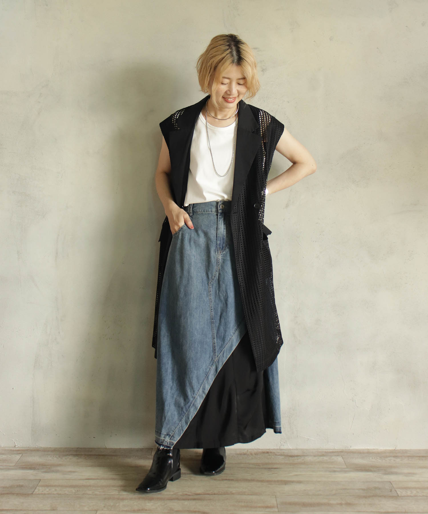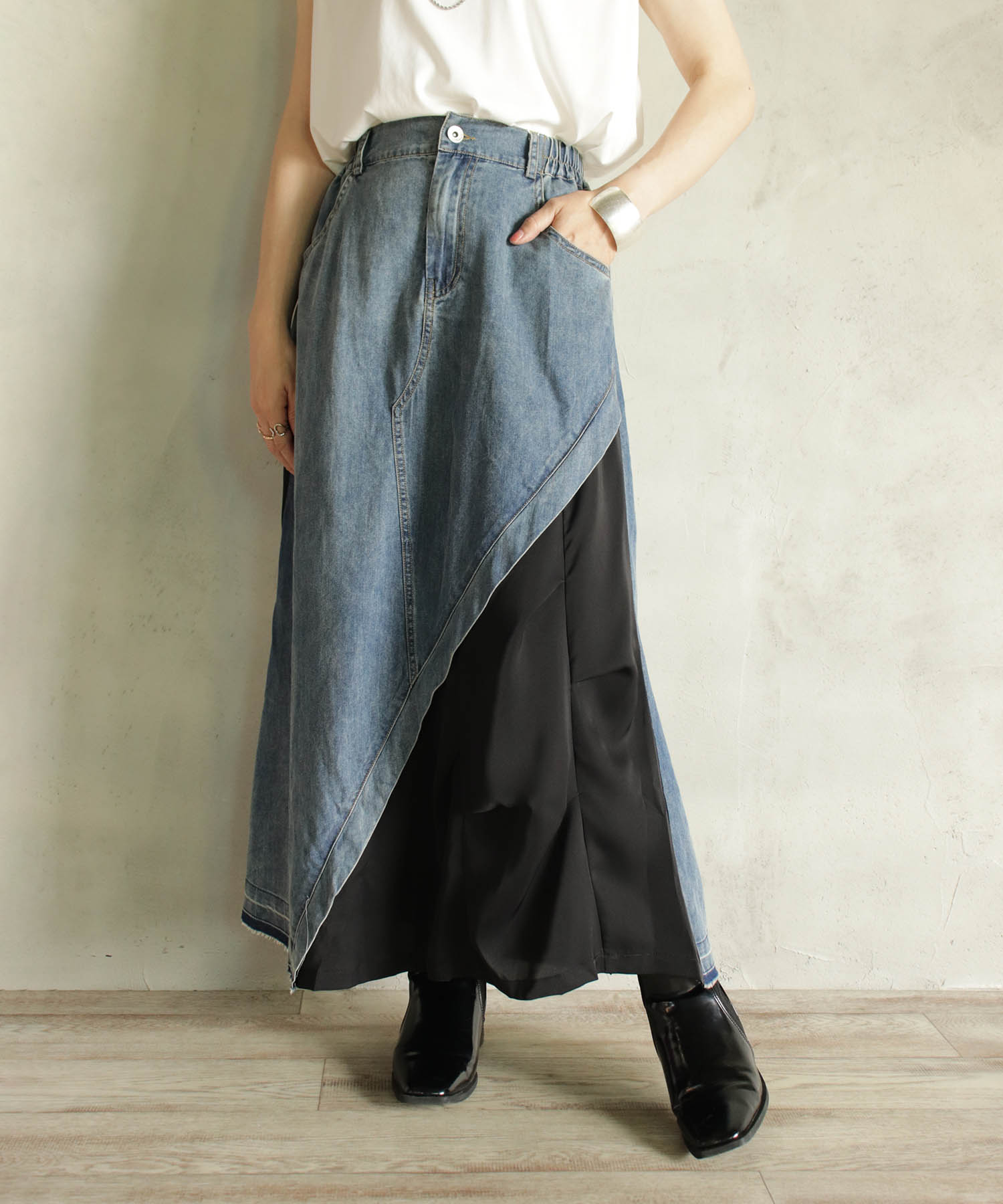 [BITTOKO] デニム切替ロングスカート(BR/BK)