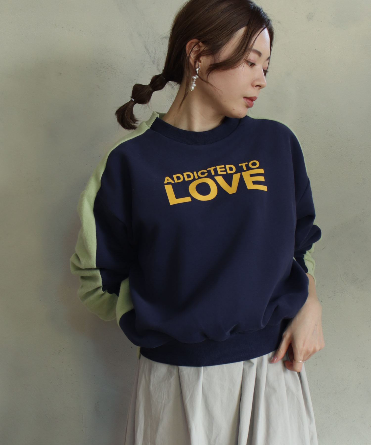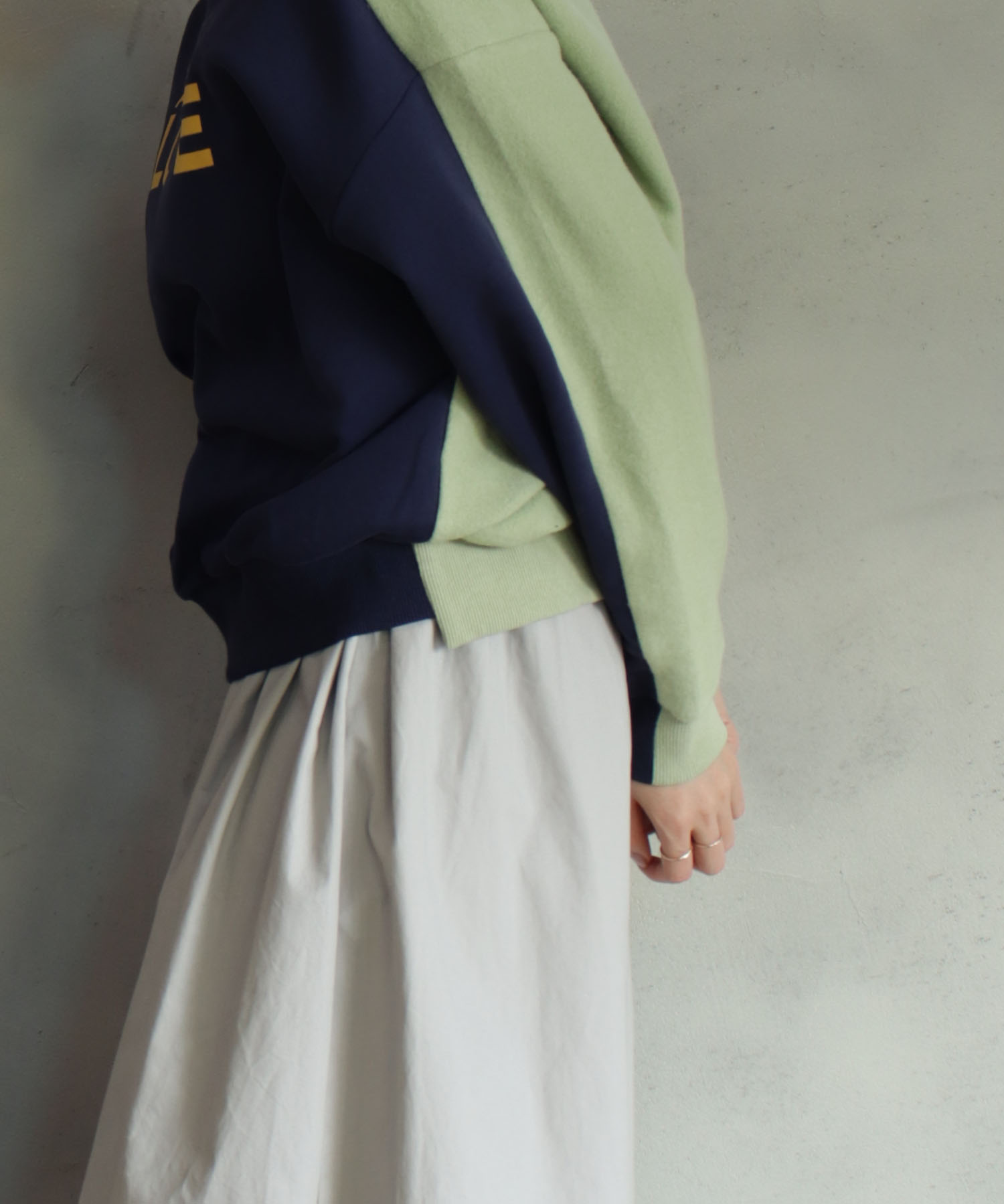 春先まで使えるパステルカラーとのバイカラースウェット。