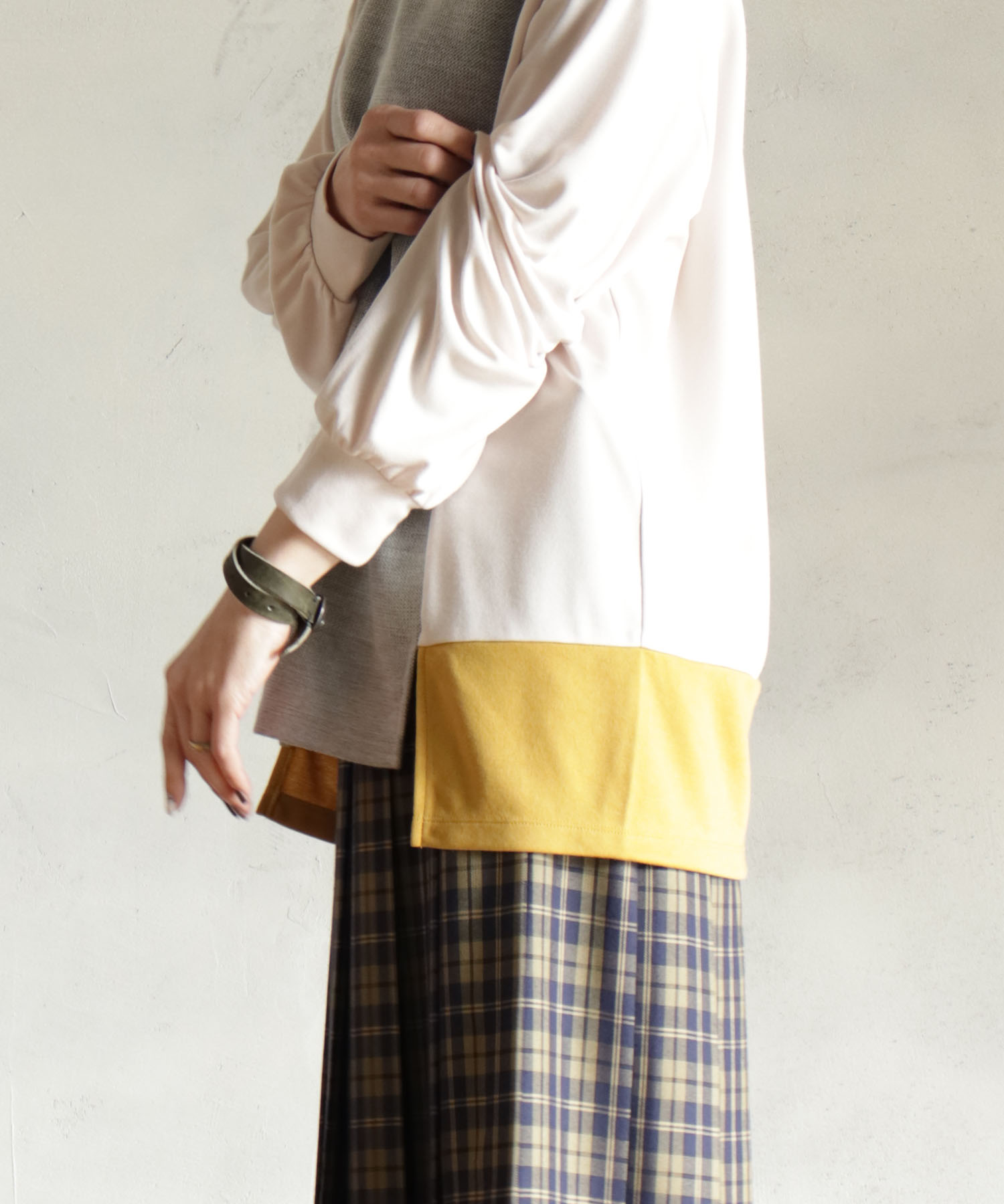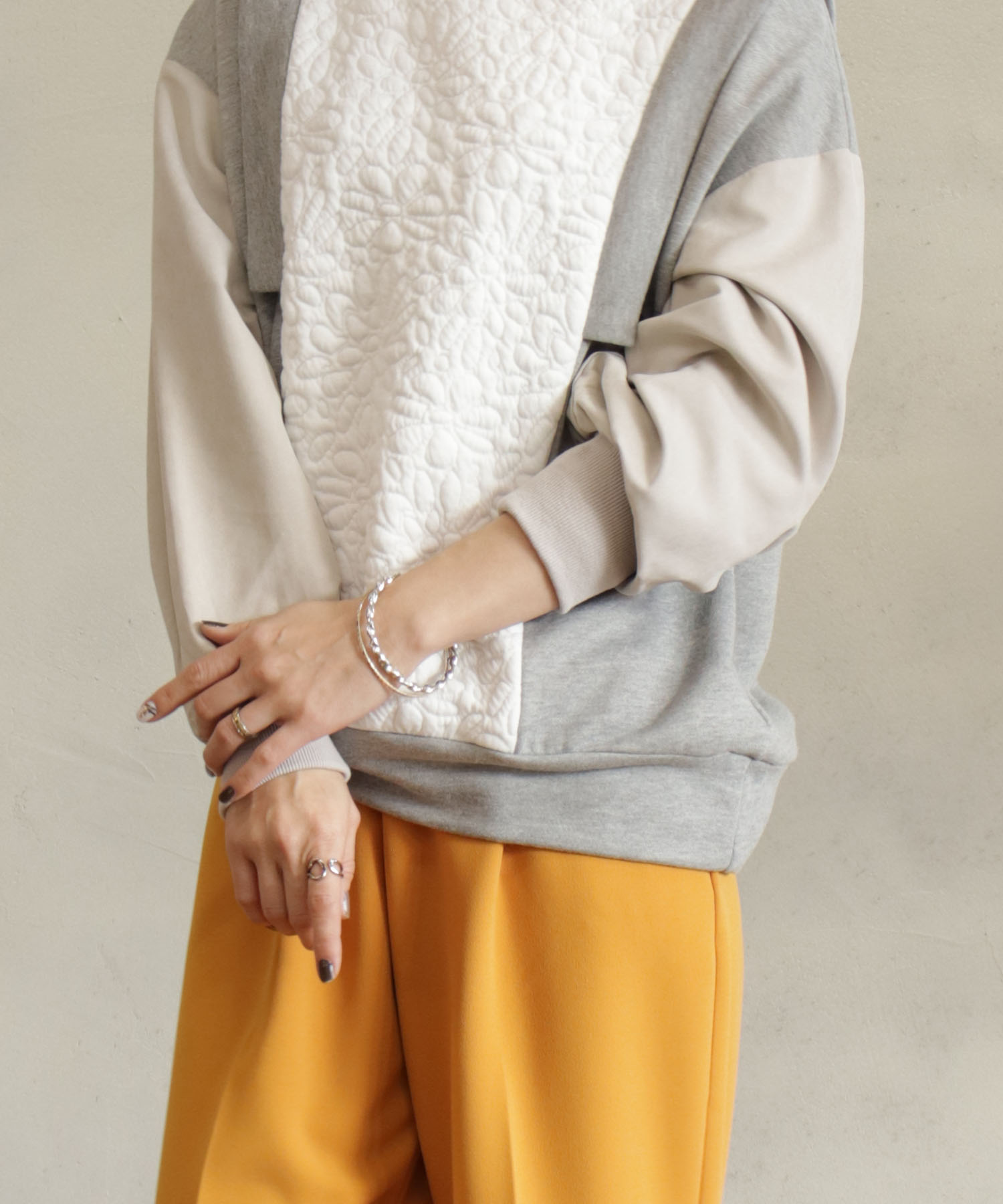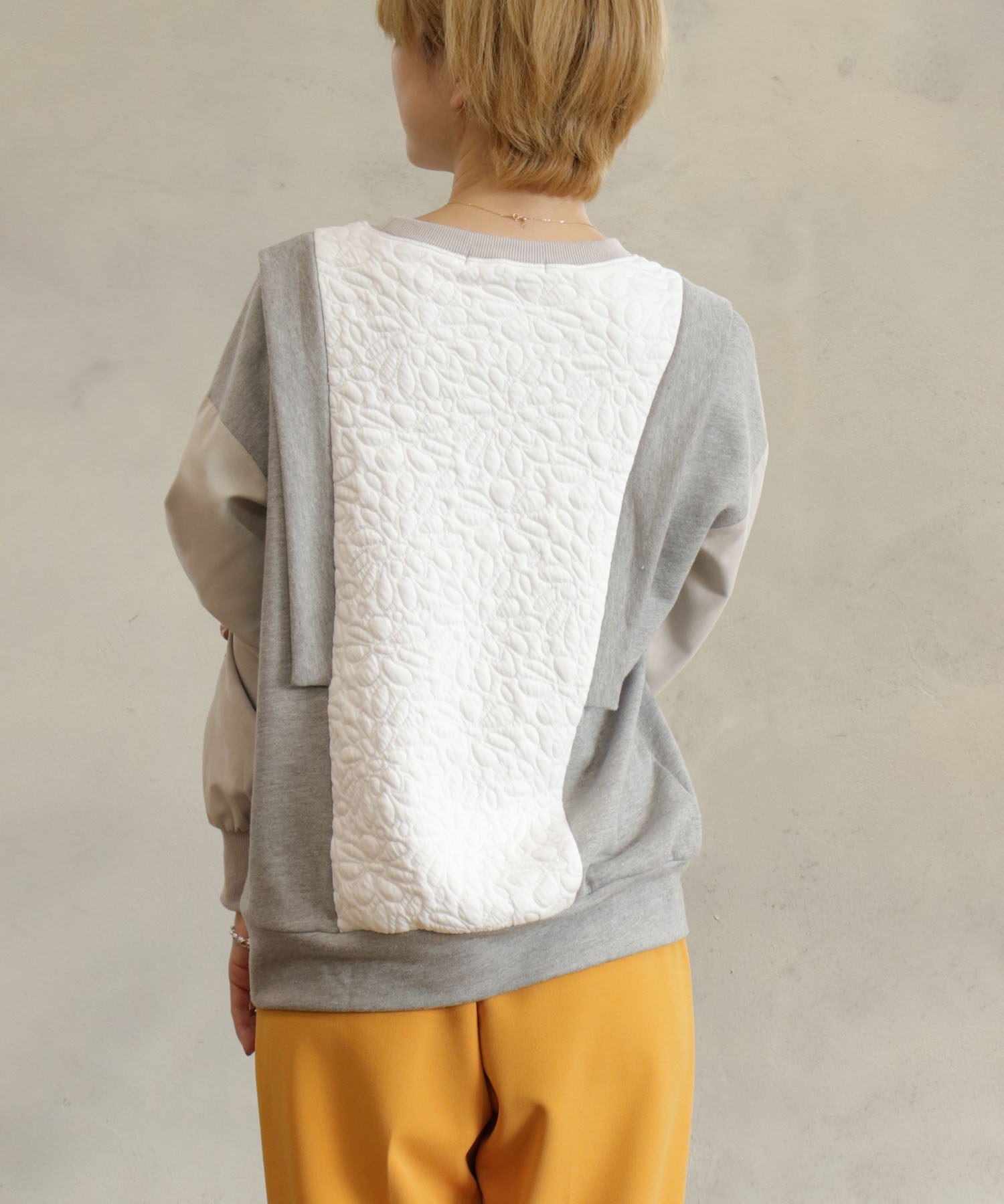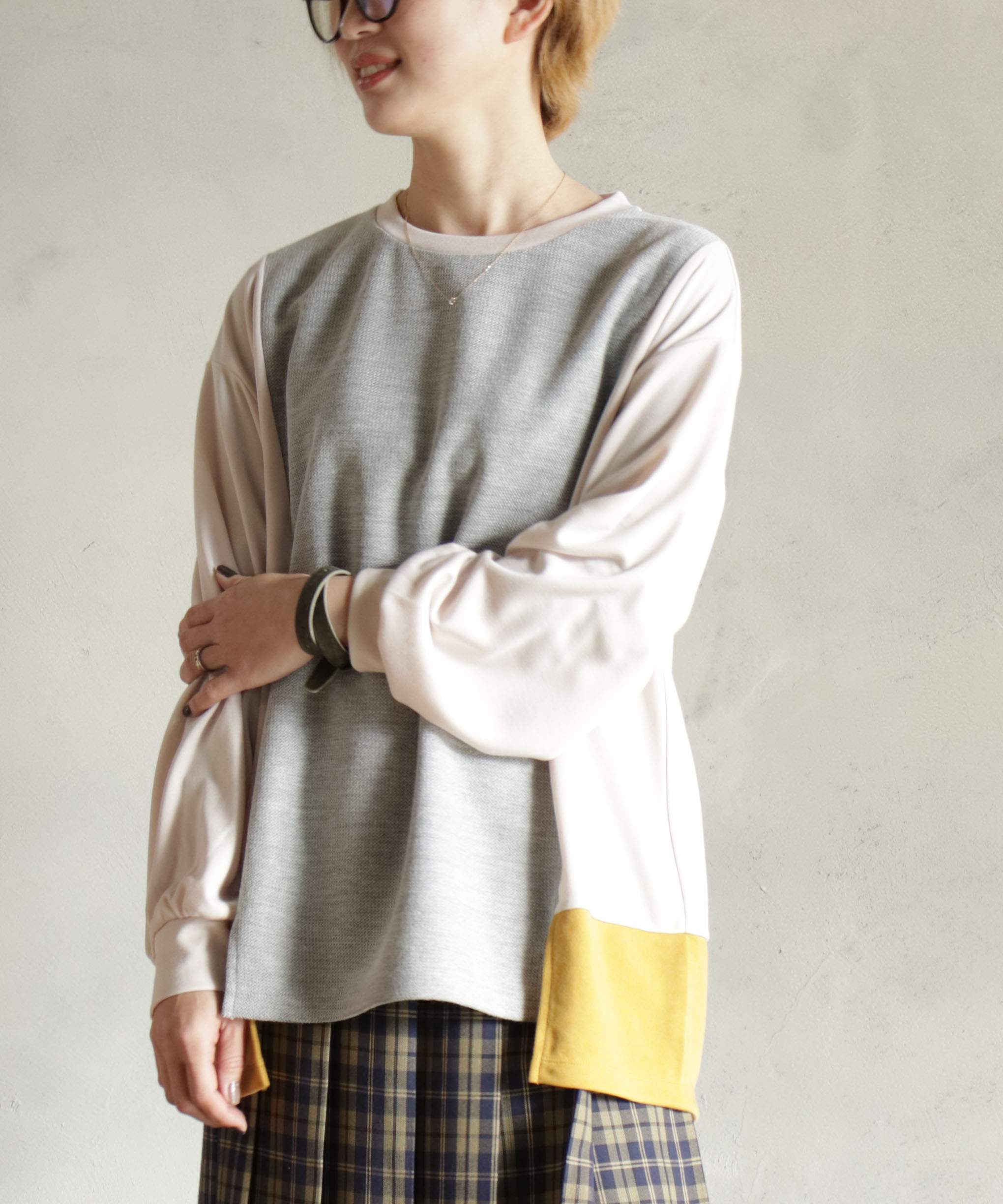 カットソーの異素材がドッキングされたプルオーバー。