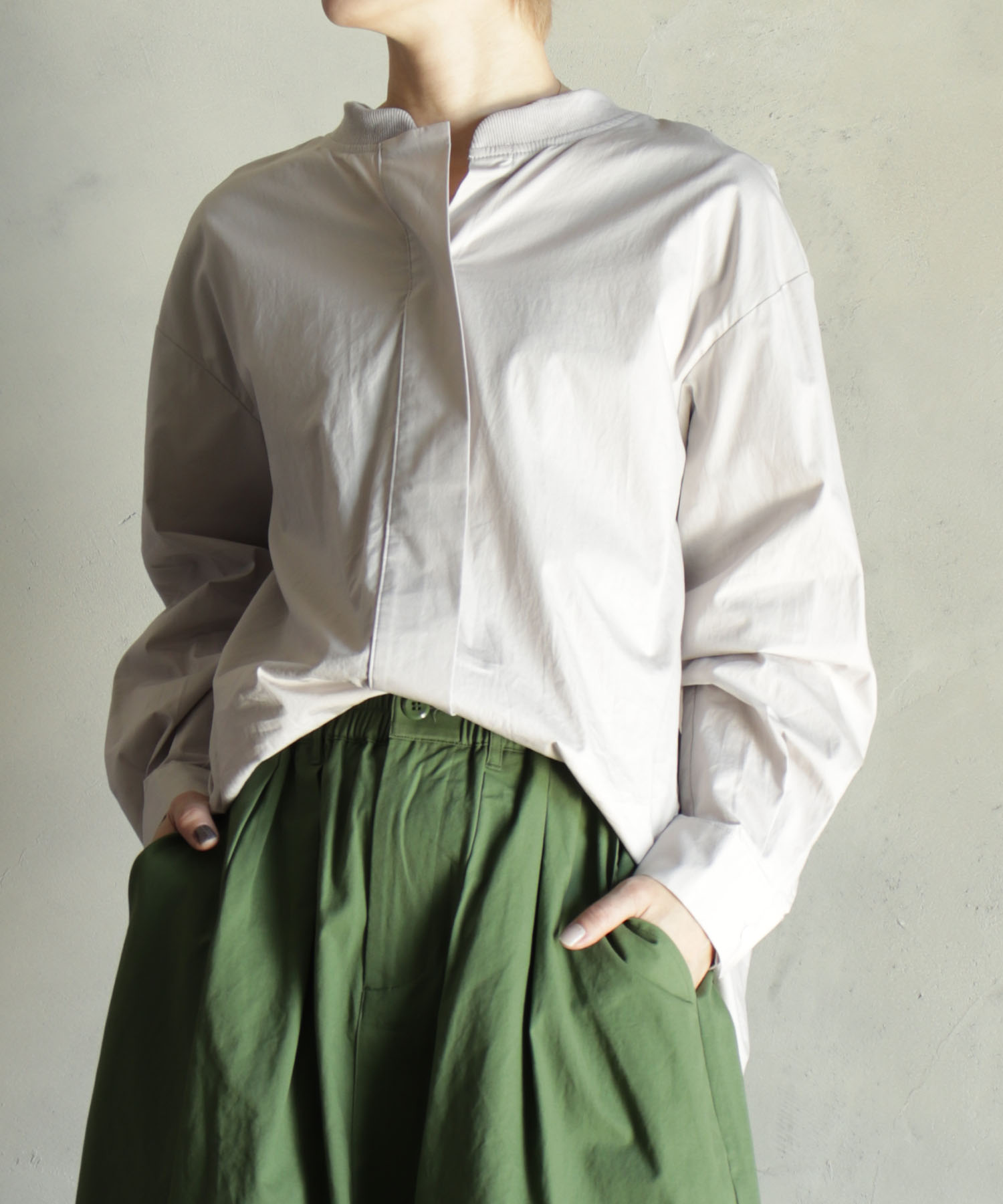 顔周りはリブですっきり、ふんわりとボリュームのある袖のシルエットはルーズ感を引き出し、こなれた印象に。