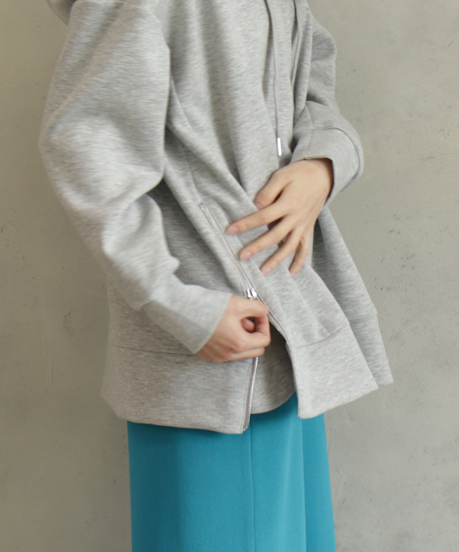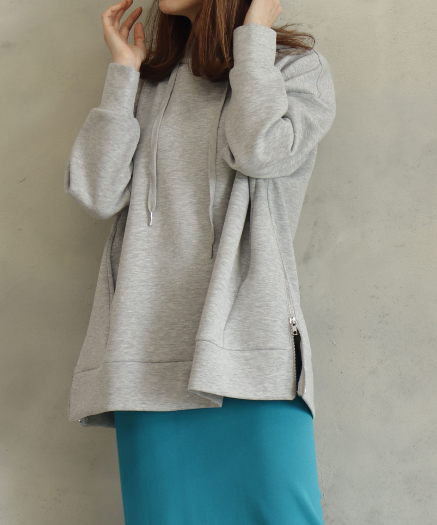 ドロップショルダーでゆったりしたサイジングのサイドのファスナーが目を引くオーバーサイズフーディー。