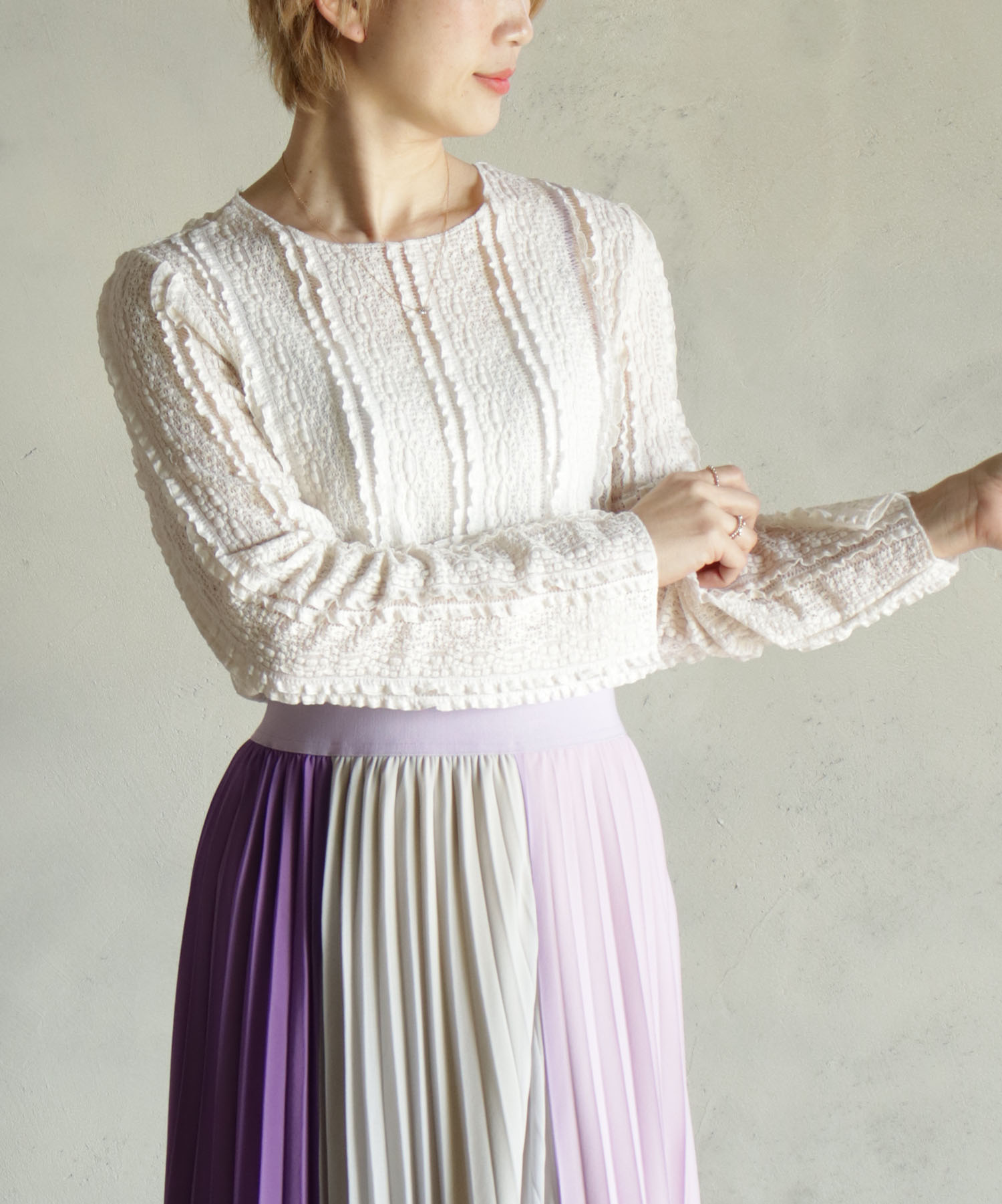 一枚でももちろん可愛いですが、ジレなどと重ねるとスタイリングがワンランクアップ。カジュアルから綺麗めスタイルまで、どんなコーデにも合う上品なアイテムです。