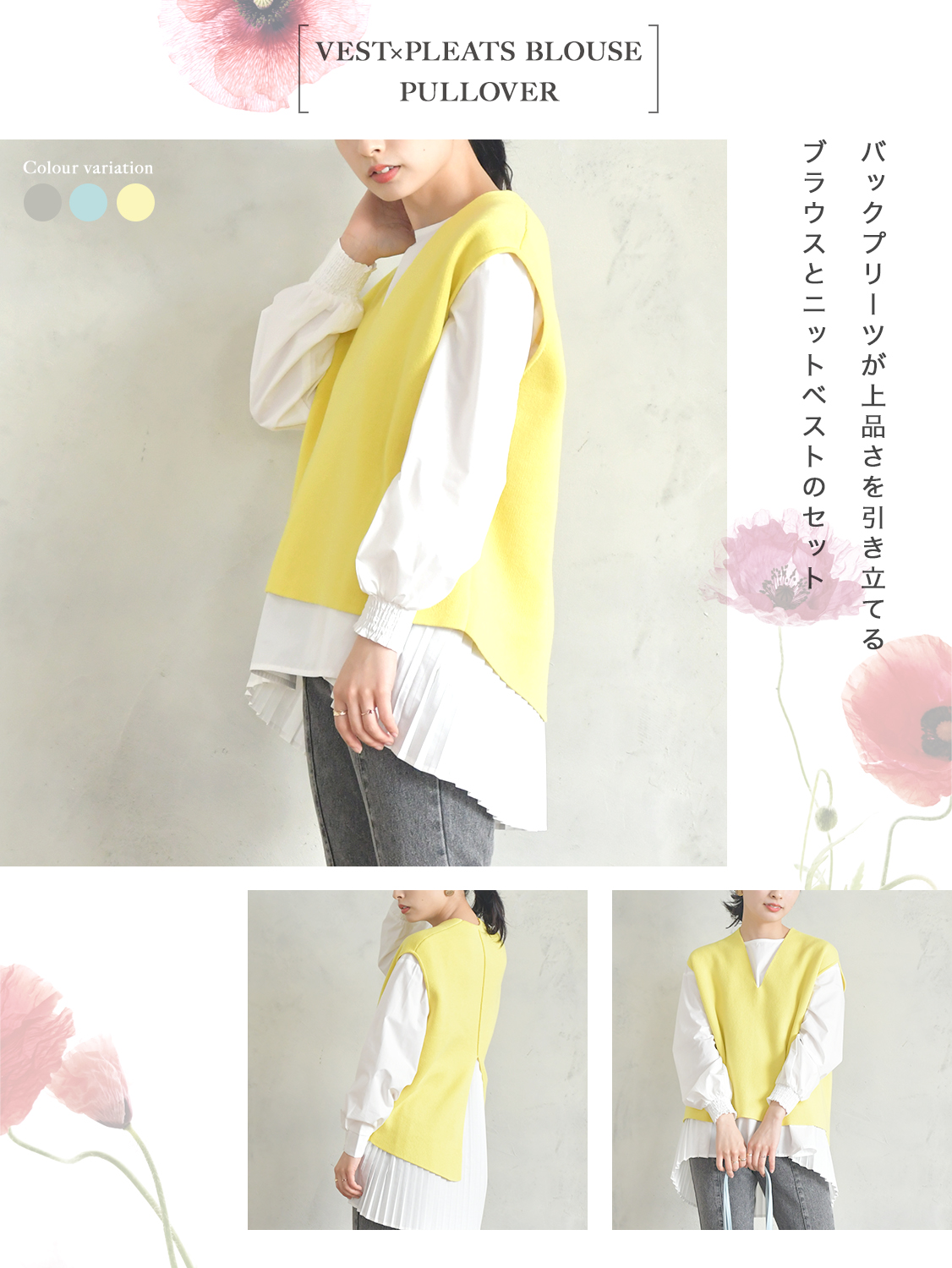 バックのプリーツが上品さを引き立てるブラウスとトレンドカラーのニットベストのセット。