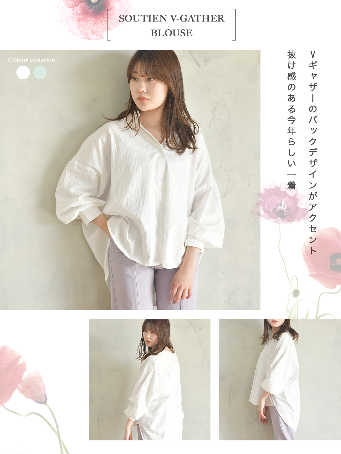 Vギャザーのバックデザインがアクセントのステンオーバーブラウス。
