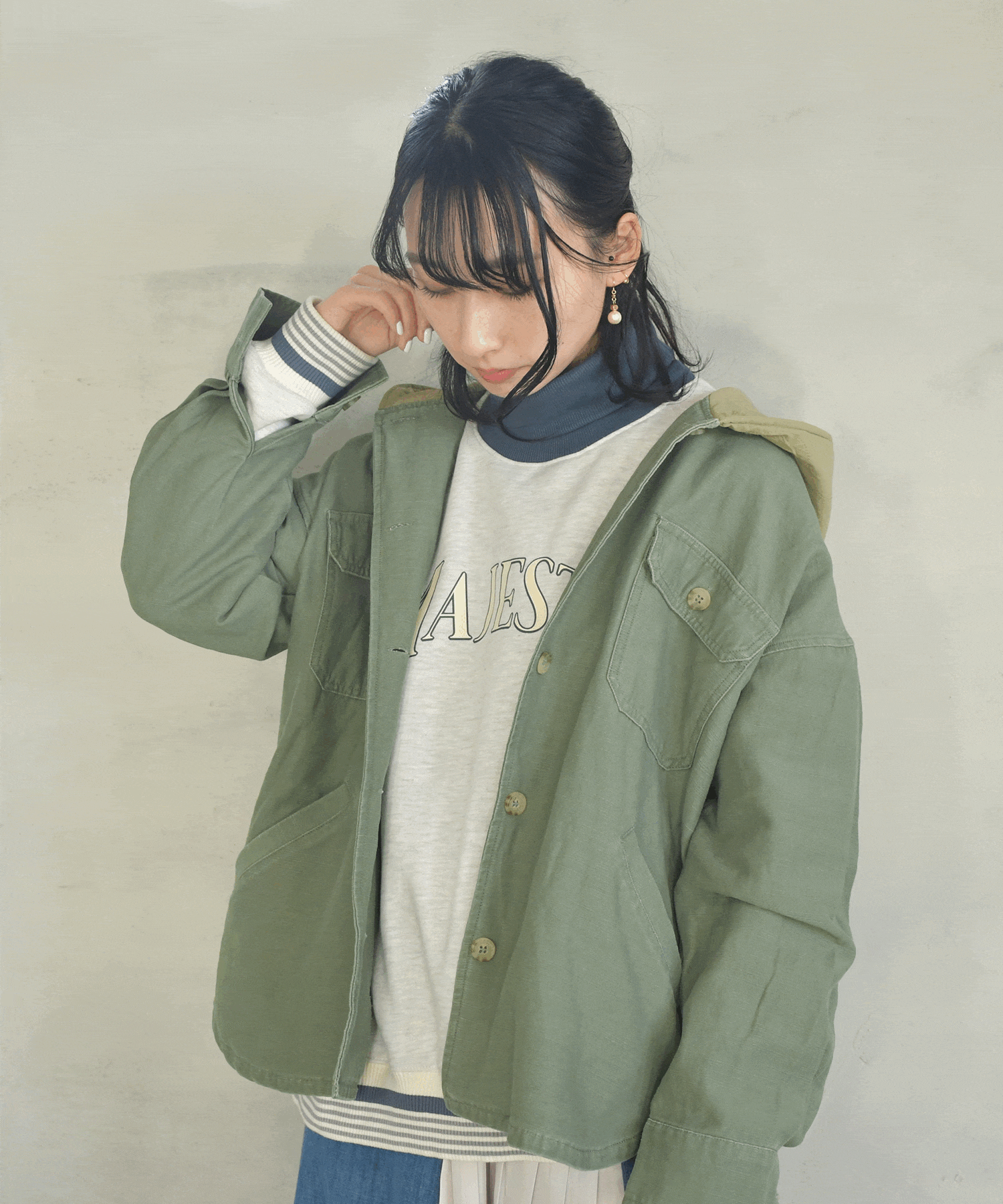 季節に合わせてインナーにフーディー、カットソーやワンピースなどに羽織っても好相性です。