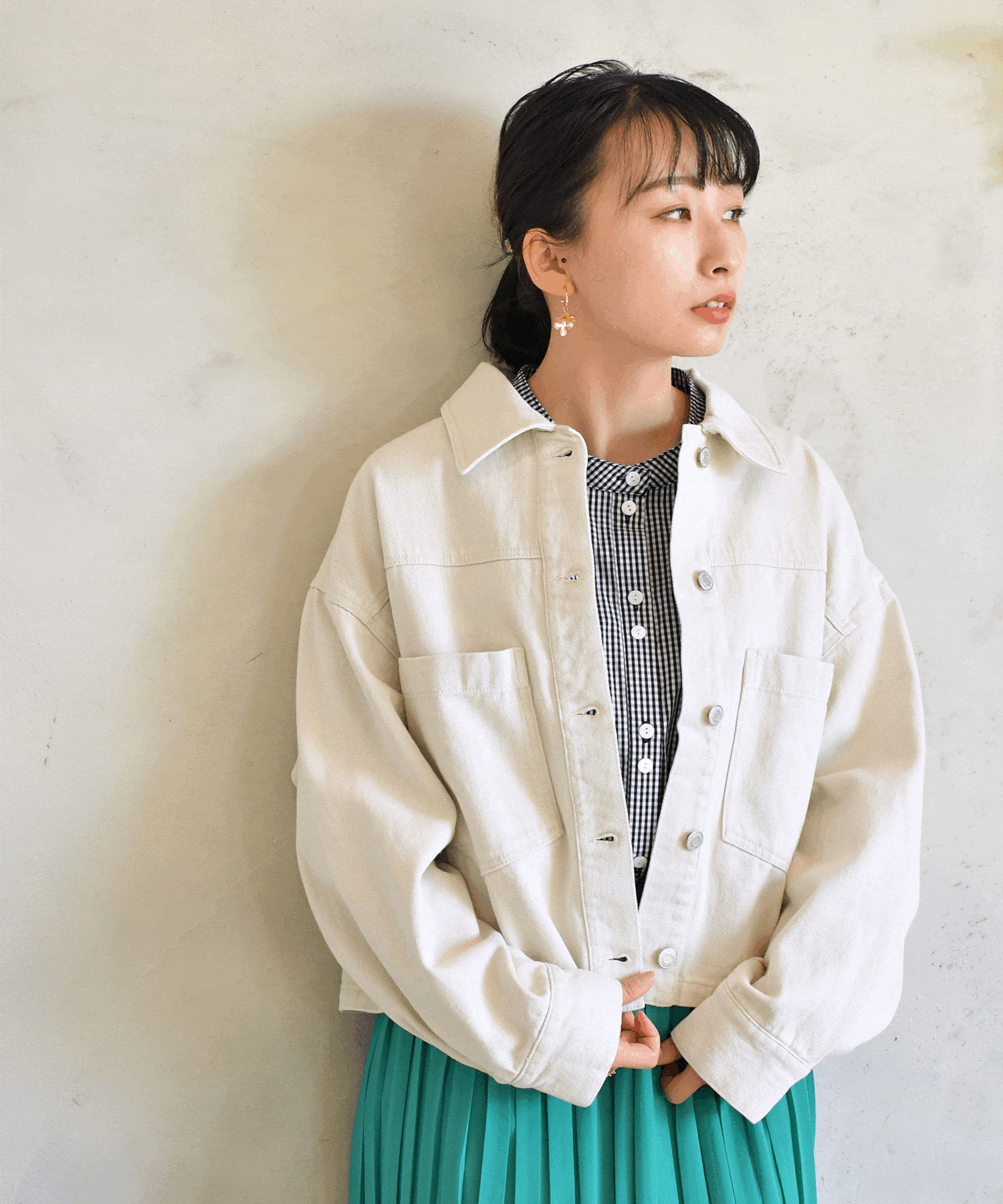 ショート丈なので、裾からシャツやカットソーなどを見せたレイヤードコーデがおすすめ。